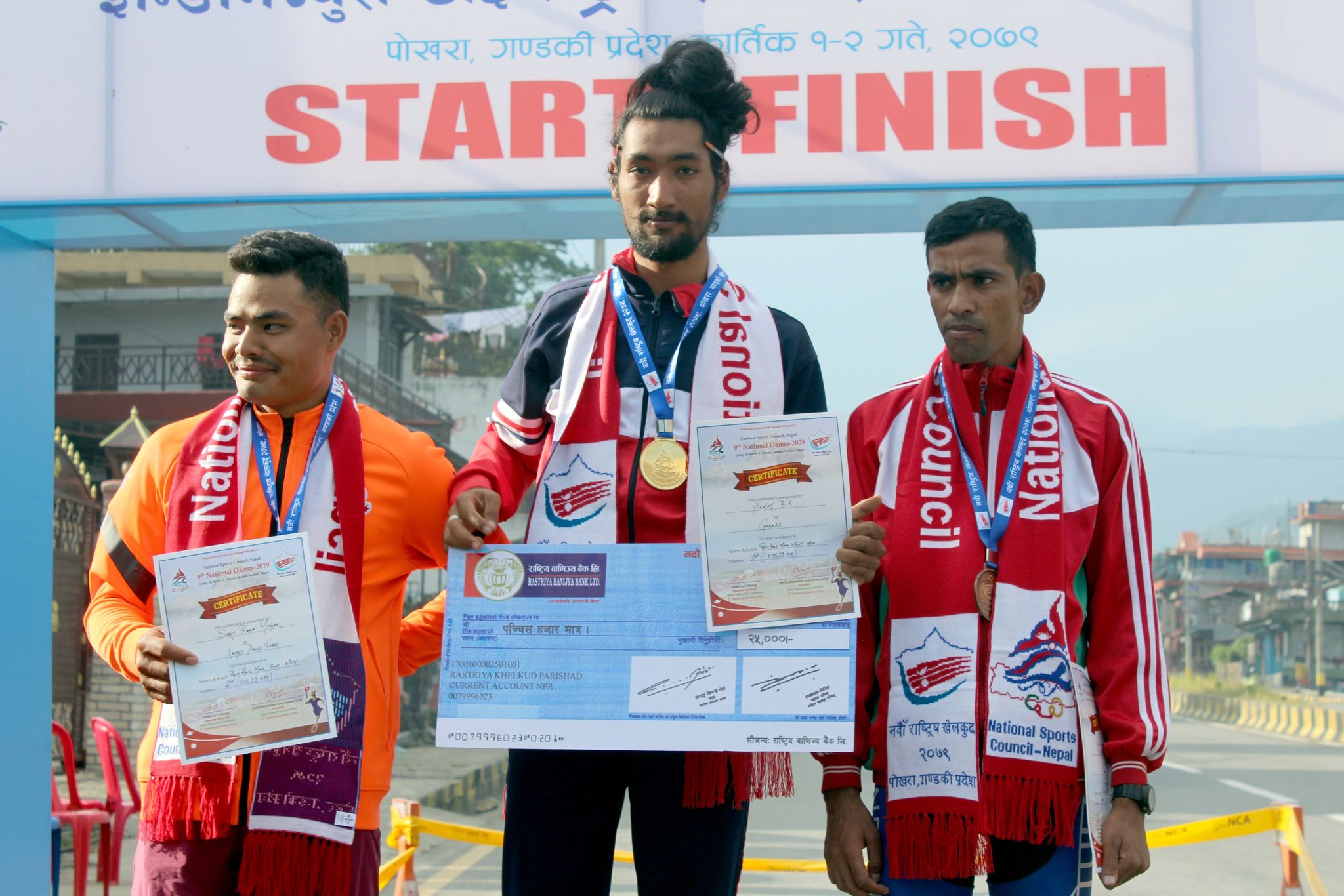 त्यस्तै उक्त दुरी १ घण्टा ५५ मिनेट २१ सेकेण्ड ४१४ मिलिसेकेण्डमा पुरा गर्दै एपिएफका सुरज रानामगरले रजत पदक जितेकका छन् । त्यसैगरि १ घण्टा ५५ मिनेट २१ सेकेण्ड ८६१ मिलिसेकेण्डमा दुरी पुरा गर्दै नेपाल आर्मीका हिमाल टमाटाले कास्य जित्न सफल भएका छन् ।