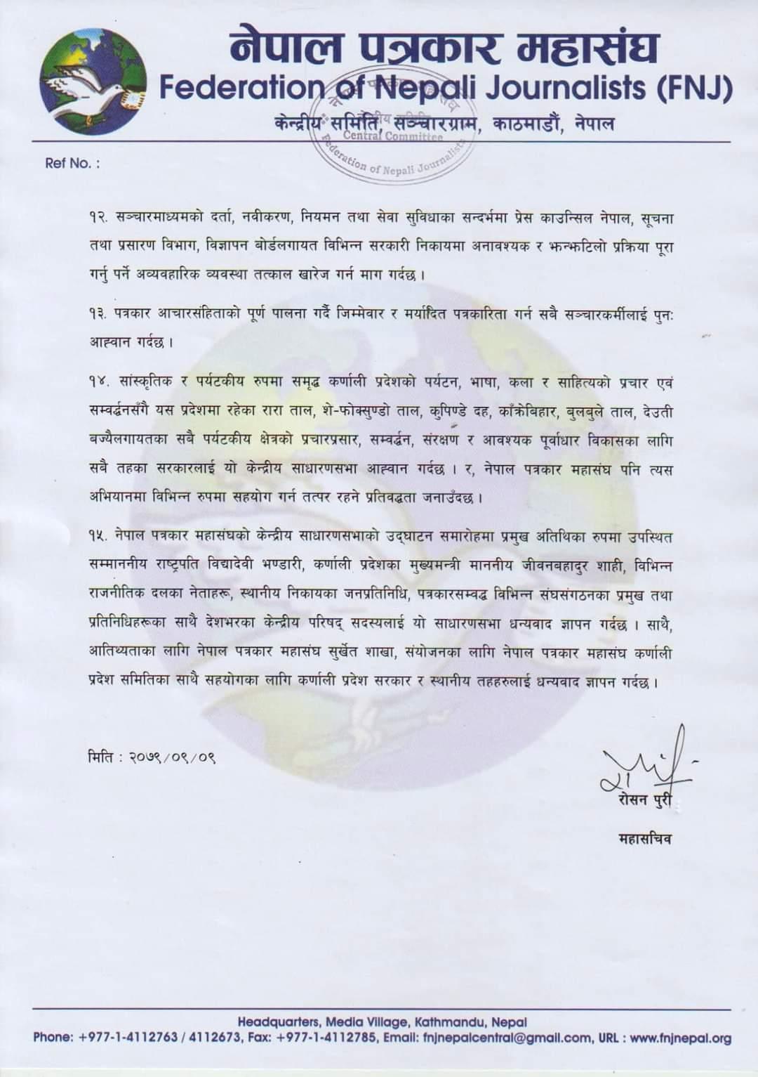 महासंघले जारी गरेको सुर्खेत घोषणापत्रका पत्रकारका हकहित सुरक्षा, इन्टरनेटको प्रयोग गरी भइरहेको स्वतन्त्रताको हक हनन, विधिन्न तहका सरकारमा भइरहेका सूचनाको हकको हनन, सञ्चारसम्बन्धी विभिन्न कानुन निर्माणमा ढिलाइ जस्ता विषयलाई जोड दिइएको छ । प्रेस स्वतन्त्रता हननका घटना रोक्न समेत महासंघले जोड दिएको छ ।