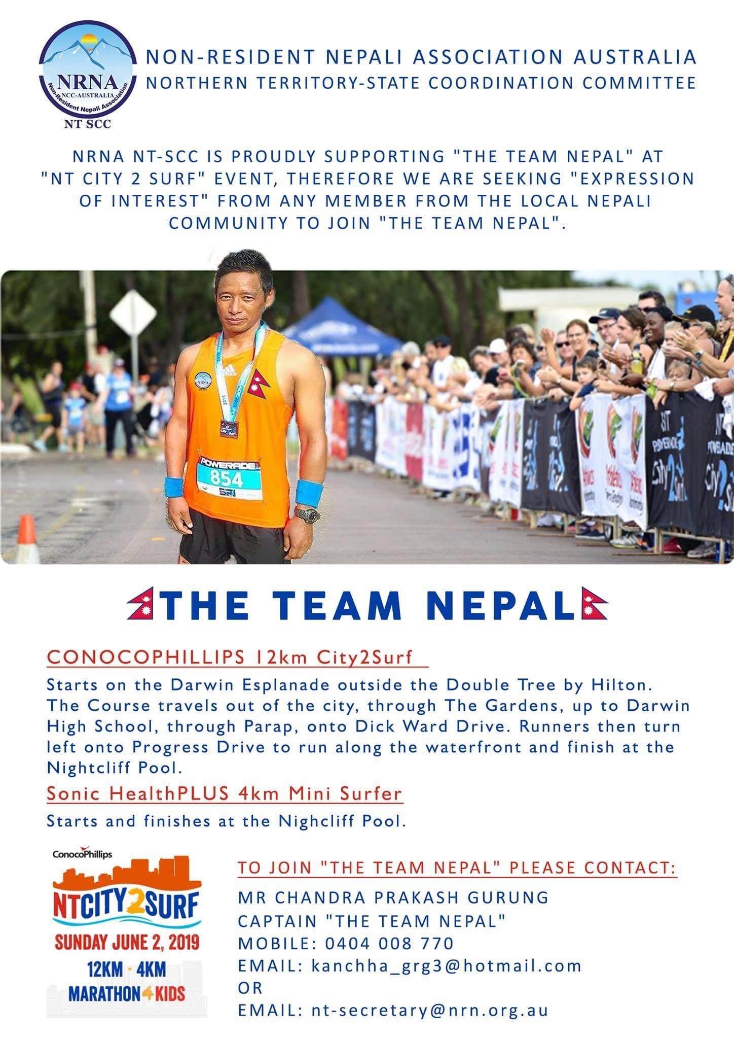 डार्विनमा हुने सबभन्दा ठुलो दौड एनटि सिटी टु सर्फमा नेपाली हरुलाई सहजरुपले सहभागी गराउन बिगत ४, ५ बर्षदेखि टिम नेपालको स्थापना गरी संस्थापक संयोजक रुपमा नेतृत्व गर्दै आएका छन् । गत बर्ष करीब २६ जना नेपालीलाई एनटि सिटी टु सर्फ दौडमा सहभागी बनाउन सफल भए ।