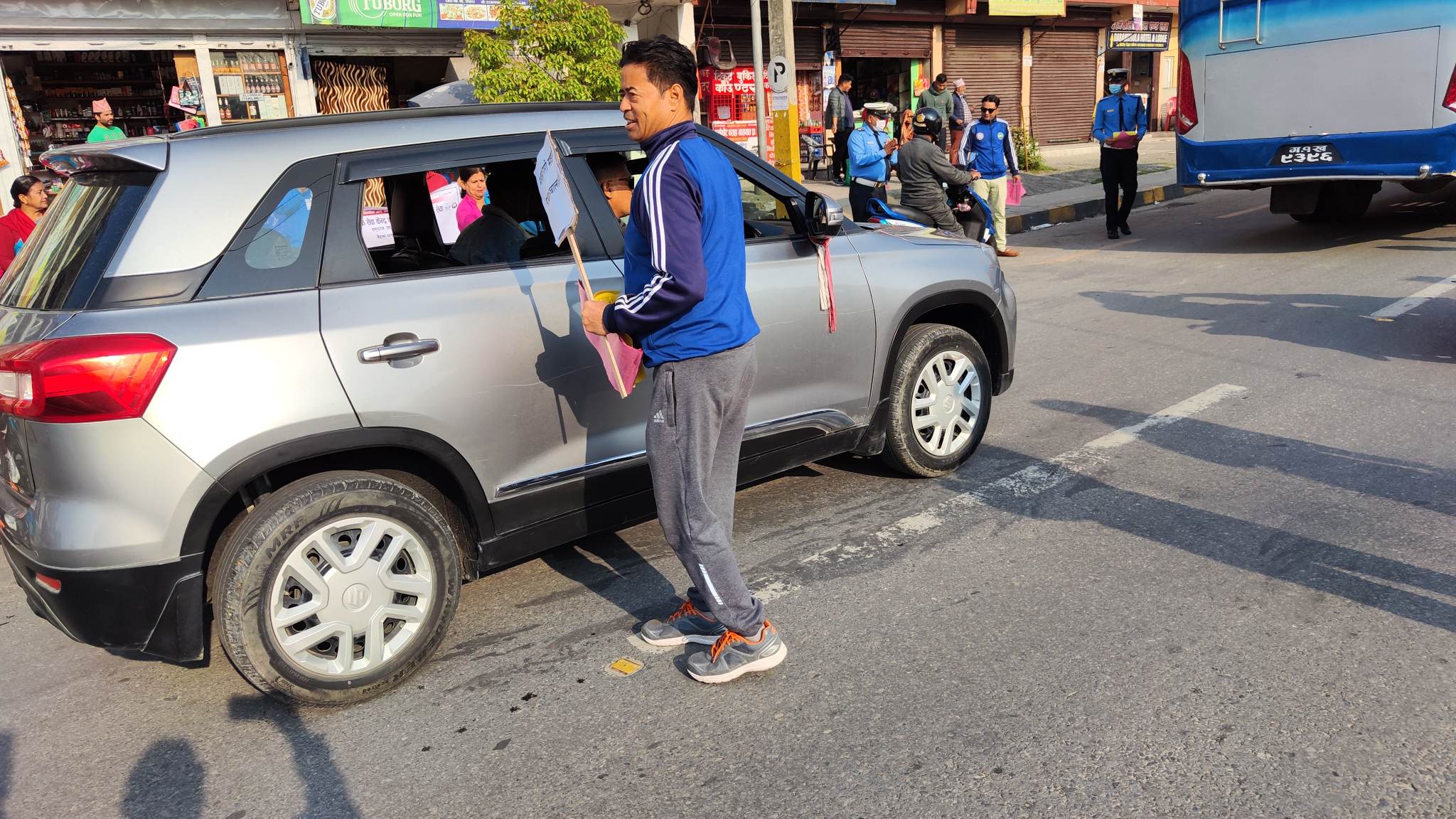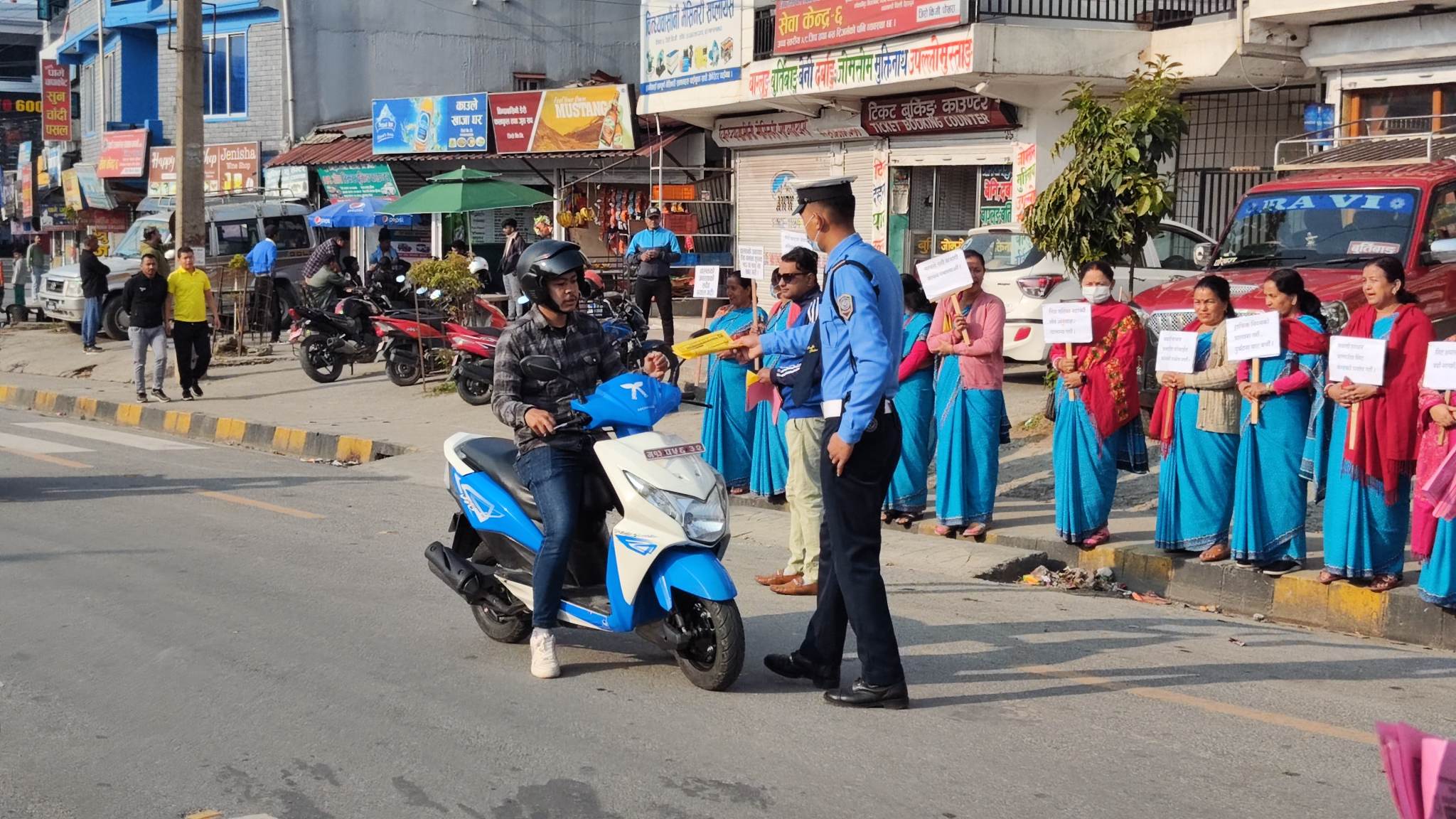 पोखरा । पोखरामा बढ्दै गएको सवारी दुर्घटनालाई न्यूनीकरण गर्न चालकहरुलाई ट्राफिक सचेतना गराइएको छ । आज (आइतबार) पोखराको जिरो किमी सडकखण्डमा सामुदायिक सेवा केन्द्र एवं सामुदायिक प्रहरी सेवा बैदामको आयोजना तथा ट्राफिक प्रहरी प्रस्याङ बिट, अभियान महिला समूह र अभियान युवा क्लबको सहकार्यमा उक्त सचेतना गरिएको हो ।