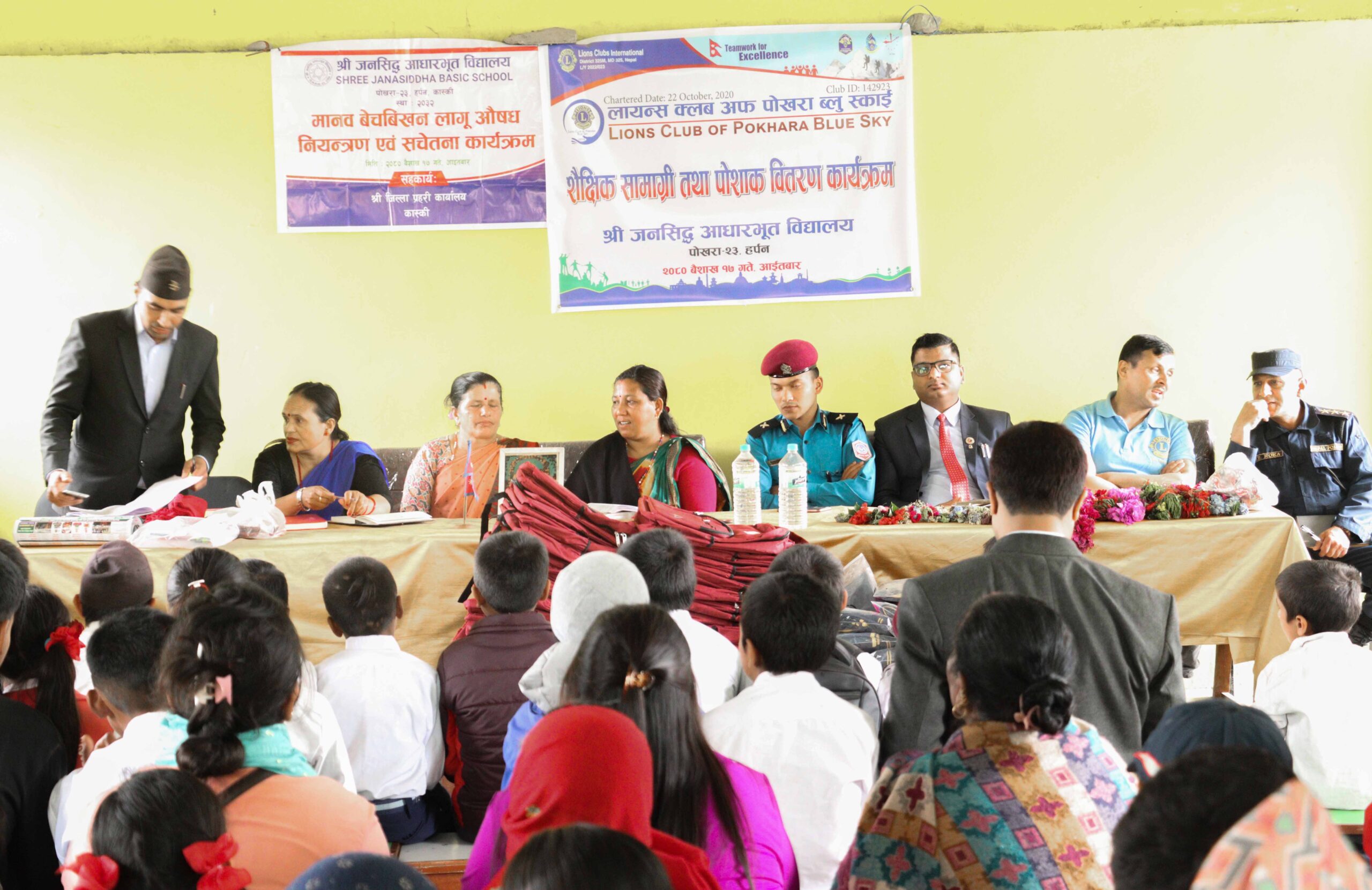 पोखरा । लायन्स क्लब अफ पोखरा ब्लु स्काईले विद्यार्थीलाई शैक्षिक सामाग्री तथा पोशाक वितरण गरेको छ । पोखरा २३ हर्पनमा अवस्थित श्री जनसिद्ध आधारभूत विद्यालयमा अध्ययनरत विद्यार्थीहरुलाई शैक्षिक सामाग्री तथा पोशाक वितरण गरिएको हो ।