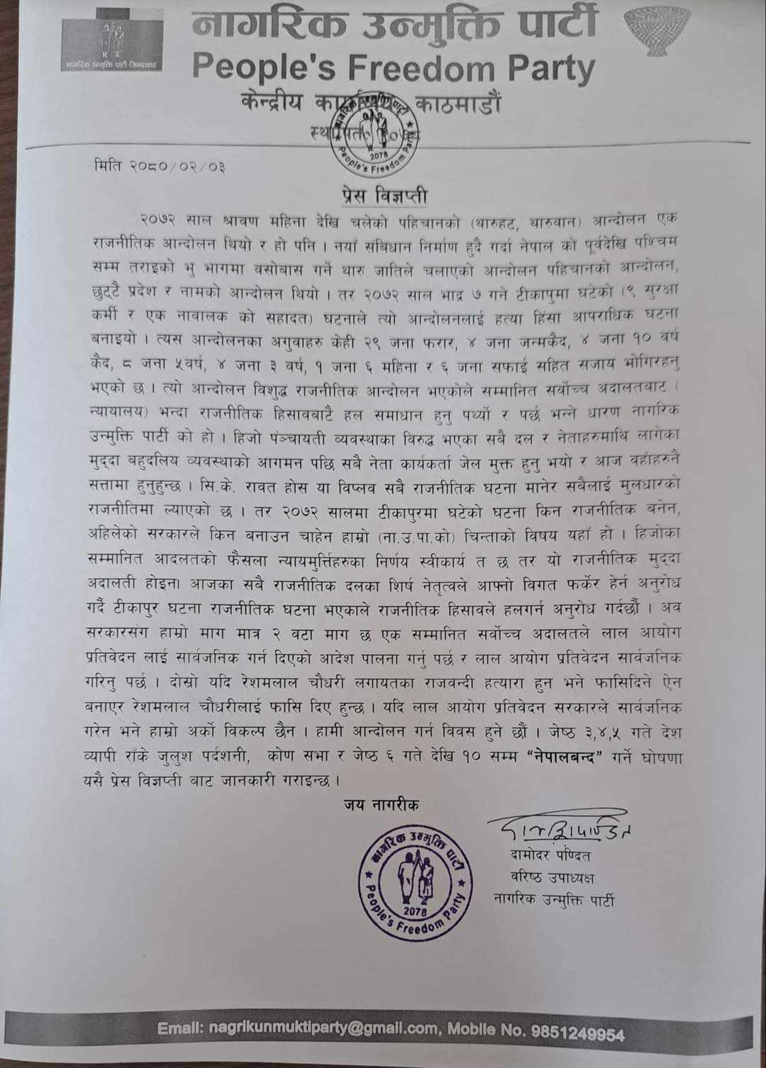 काठमाडौं । नागरिक उन्मुक्ति पार्टीले सर्वोच्च अदालतको आदेशअनुसार लाल आयोगको प्रतिवेदन सार्वजनिक गर्न माग गरेको छ ।