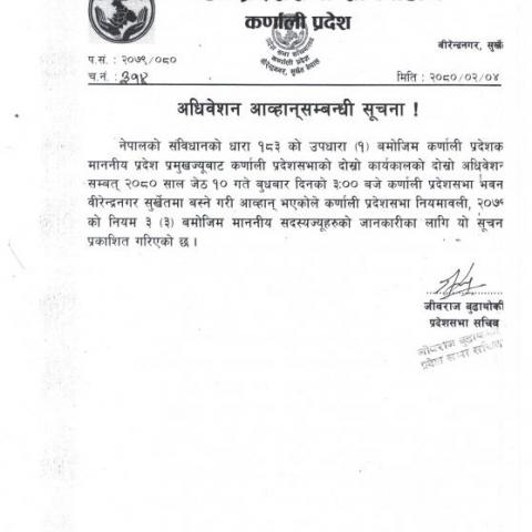 ‘नेपालको संविधानको धाराा १८३ को उपधारा (१) बमोजिम कर्णाली प्रदेशका माननीय प्रदेश प्रमुृखज्यूवाट कर्णाली प्रदेशकासभाको दोस्रो कार्याकालको दोस्रो अधिवेसन सम्बत २०८० साल जेठ १० गते बुधवार दिनको ३ः०० कर्णाली प्रदेशसभा भवन, बिरेन्द्रनगर सुर्खेतमा बस्ने गरी आब्हान भएकाले कर्णाली प्रदेशसभा नियमावली २०७०को नियम ३ (३) बमोजिम माननीय सदस्यज्यूहरुको जानकारीका लागि यो सुचना प्रकाशित गरिएको छ’ प्रदेश सभा सचिव जीवराज बुढाथोकीले जारी गरेको सुचनामा उल्लेख छ ।