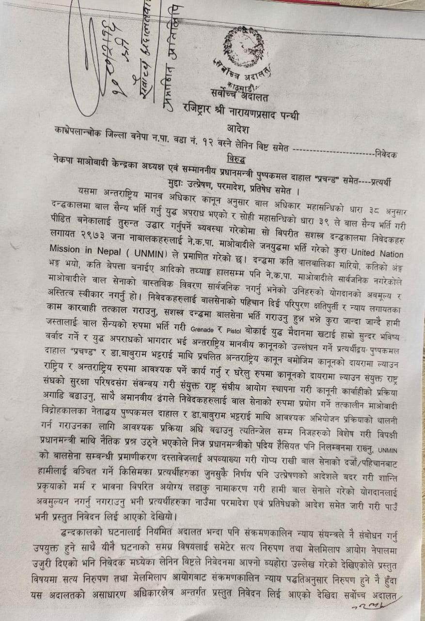 घ) विपक्षीहरुबाट नेपाल सरकार र नेकपा माओवादी बीच सम्पन्न विस्तृत शान्ति सम्झौता २०६३, नेपाल सरकार र नेकपा माओवादी बीच भएको हतियार र सेना व्यवस्थापनको अनुगमन सम्झौता २०६३, बाल अधिकार सम्बन्धी महासन्धि र त्यसको Optional Protocal, TRC Act को दफा २(ञ)(९), बाल सेना प्रयोग सम्बन्धी अन्तर्राष्ट्रिय मनवीय कानुन, सम्मानित सर्वोच्च अदालतबाट भएका फैसला र प्रतिपादित नजीर, नेपालको संविधान लगायतका प्रचलित कानुनहरु विपरितका कार्यहरु भएकोले ती उल्लेखित कानुनहरुको अक्षरशः पालना गर्नु गराउनु र हामीलाई बाल सेनाको रुपमा परिभाषित गरी पहिचान दिलाई सोही अनुसार परिपुरण, क्षतिपूर्ति र न्याय दिलाई भराई पाउन विपक्षीहरुका नाममा परमादेश जारी गरी पाऊँ । साथै सशस्त्र द्वन्द्वमा बाल सेना भर्ती गर्नु गराउनु हुन्न भन्ने तथ्य ढाँटी हामी जस्तालाई बालसैन्यको रुपमा भर्ती गरी हाम्रो सुन्दर भविष्य बरबाद गर्ने र युद्ध अपराधको भागीदार भै अन्तर्राष्ट्रिय मानवीय कानुनको उल्लंघन गर्ने विपक्षीद्वय पुष्पकमल दाहाल र डा. बाबुराम भट्टराई माथि प्रचलित अन्तर्राष्ट्रिय कानुन बमोजिम कानूनको दायरामा ल्याउन राष्ट्रिय र अन्तर्राष्ट्रिय रुपमा आवश्यक पर्ने कार्य गर्नु र घरेलु रुपमा कानूनको दायरमा ल्याउन संयुक्त राष्ट्र संघको सुरक्षा परिषद संग समन्वय गरी संयुक्त राष्ट्र संघिय आयोग (उदाहरणका लागि रुवान्डा वा युगोस्लाभियामा स्थापित आयोग (Tribunal)स्थापित गरी कानूनी कार्यबाहीको प्रक्रिया अघि बढाउनु र सो को प्रगति विवरण सम्मानित सर्वोच्च अदालतलाइ नियमित रुपमा पेश गर्नु भनि परमादेशको आदेश जारि गरी पाउँ ।