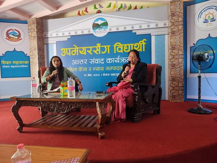 पोखरा । स्थानीयस्तरमा महिला हिंसा सम्बन्धि मुद्दा र न्यायिक निरुपण विषयमा बिहिबार पोखरा महानगरपालिकाका उपमेयर मञ्जुदेवी गुरुङसँग पोखरा महानगरपालिकाभित्रका बिभिन्न बिद्यार्थीहरुको सवाल जवाफ तथा अन्तरसंवाद सम्पन्न भयो ।