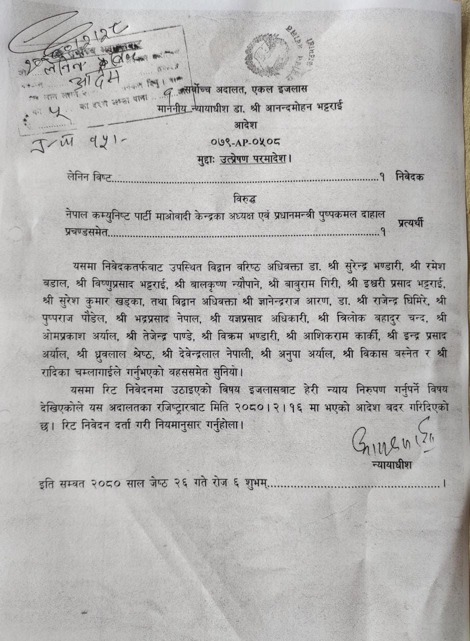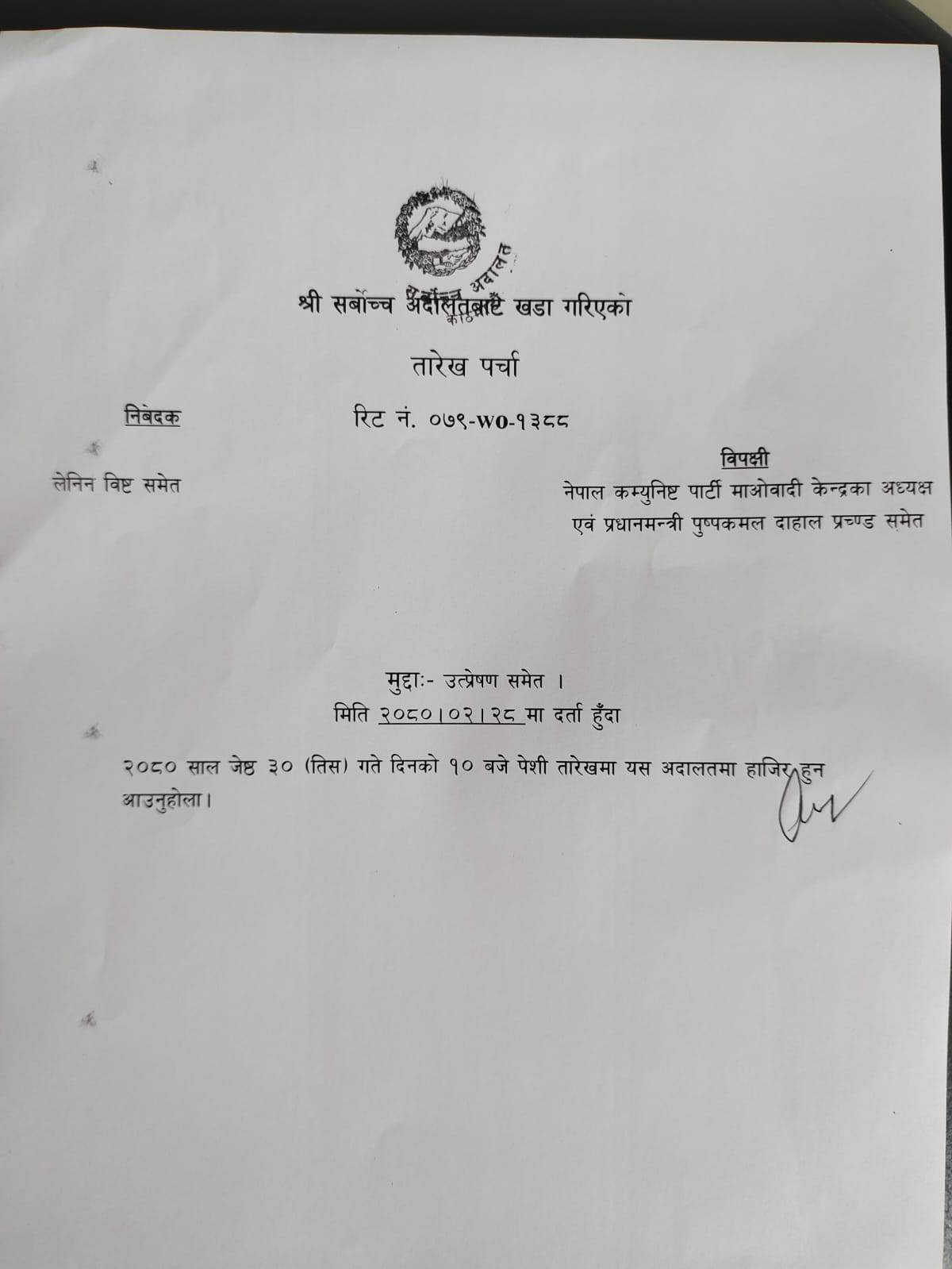 प्रधानमन्त्री प्रचण्डलाई कारबाहीको माग गर्दै सर्वाेच्चमा रिट दर्ता
