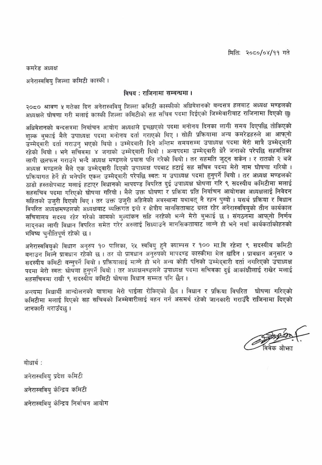 ‘अनेरास्ववियुको विधान अनुरुप १० पालिका, २५ स्ववियु हुने क्याम्पस र १०० मावि रहेका ९ सदस्यीय कमिटी बनाउन मिल्ने प्रावधान रहेको छ । तर यो प्रावधान अनुरुपको मापदण्ड कास्कीमा मेल खाँदैन । प्रावधान अनुसार ७ सदस्यीय कमिटी बन्नुपर्ने थियो । प्रक्रियालाई मान्ने हो भने अन्य कोही पनि उम्मेदवारी दर्ता नगरिएको उपाध्यक्ष पदमा मेरो स्वतः घोषणा हुनुपर्ने थियो । तर अध्यक्ष मण्डलले उपाध्यक्ष पदमा सचिवका दुई आकांक्षीलाई राखेर मलाई सहसचिवमा राखि ९ सदस्यीय कमिटी घोषणा विधान सम्मत पनि छैन । अन्त्यमा विद्यार्थी आन्दोलनको यात्रामा मेरो पाइला राकिएको छैन । विधान र प्रक्रिया विपरित घोषणा गरिएको कमिटीमा मलाई दिएको सहसचिवको जिम्मेवारीलाई वहन गर्न असमर्थ रहेको जानकारी गराउँदै राजिनामा दिएको जानकारी गराउँदछु ।’ –उनले राजिनामा कागजमा लेखेका छन् ।