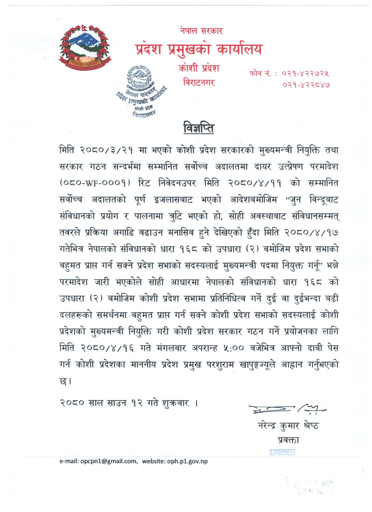 मुख्यमन्त्रीमा उद्धव थापाको नियुक्ति सर्वाेच्च अदालतले बिहीबार बदर गरेपछि शुक्रबार प्रदेश प्रमुख खापुङ्गले १६ साउन मंगलबार बेलुका ५ बजेभित्र दुई वा दुईभन्दा बढी दलको समर्थनमा बहुमत प्राप्त गर्न सक्ने कोशी प्रदेश सदस्यलाई मुख्यमन्त्रीमा नियुक्ति गरी सरकार गठन गर्न दाबी पेस गर्न आह्वान गरेका हुन् ।