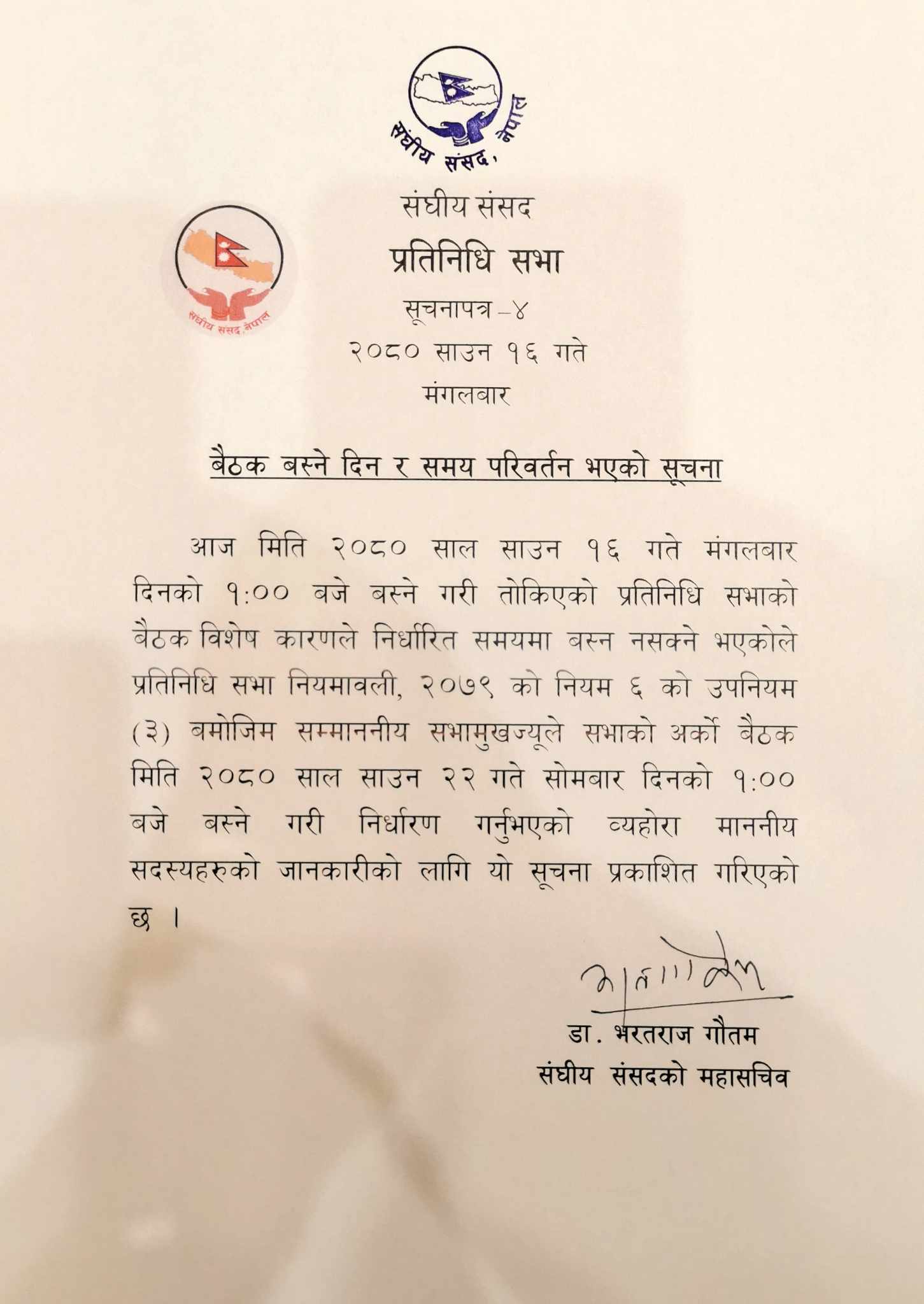 1 काठमाडौं । मंगलबार बोलाएको प्रतिनिधिसभाको बैठक सूचना निकालेर एक साताका लागि स्थगित गरिएको छ । मंगलबार दिउँसो १ बजे बोलाइएको बैठक २२ साउन सोमबार बस्नेगरी स्थगित गरिएको संसद सचिवालयले जनाएको छ ।