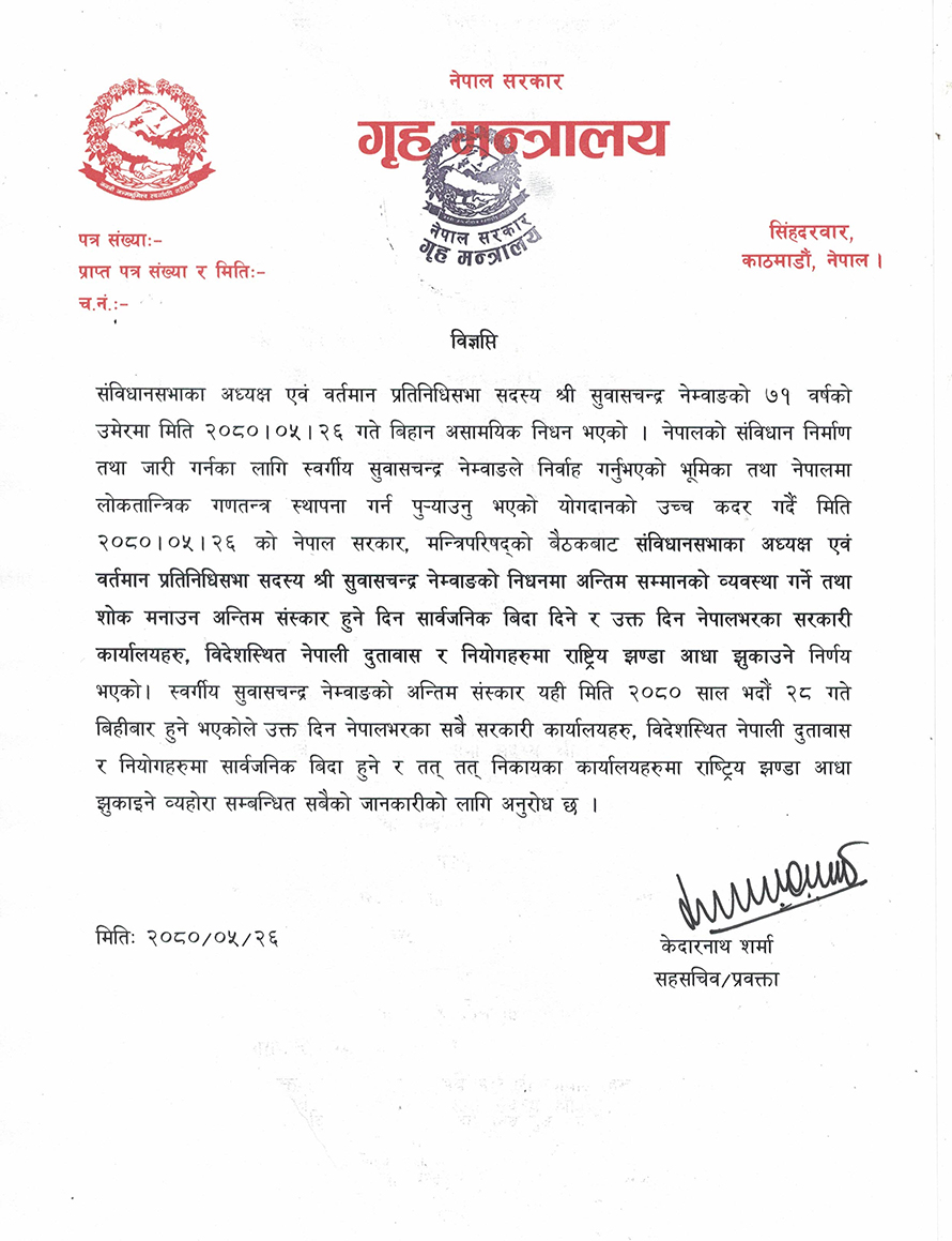 संविधानसभा अध्यक्ष तथा नेकपा एमालेका उपाध्यक्ष सुवासचन्द्र नेम्वाङको निधनको शोकमा सरकारले बिहीबार सार्वजनिक बिदा दिएको छ ।