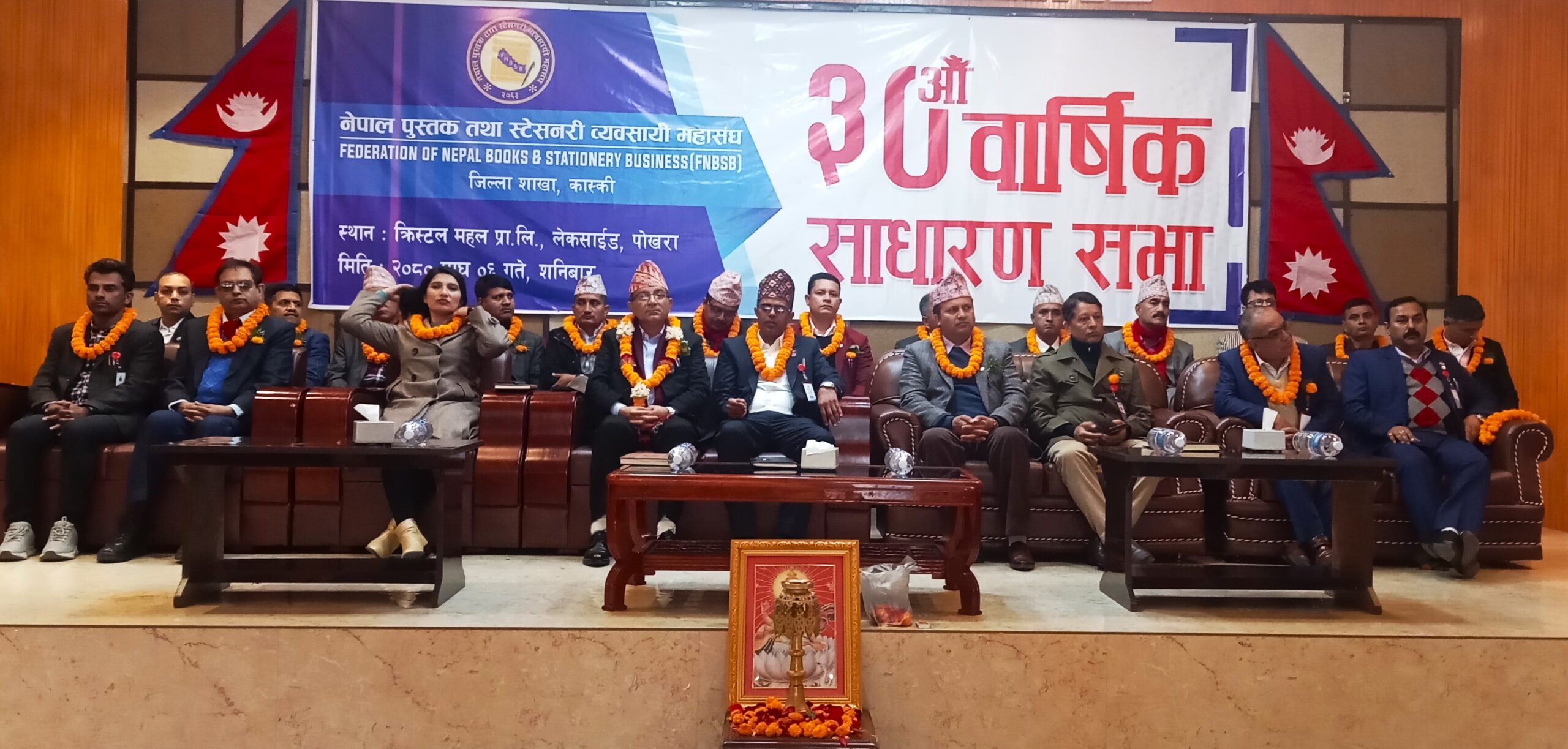 पोखरा । नेपाल पुस्तक तथा स्टेशनरी व्यवसायी महासंघ जिल्ला शाखा कास्कीको ३० औं वार्षिक साधारण सभा शनिबार सम्पन्न भएको छ । संस्थाको वार्षिक कार्य प्रतिवेदनका साथमा विभिन्न व्यक्ति तथा संस्थालाई सम्मान गर्दै साधारण सभा सम्पन्न भएको हो ।